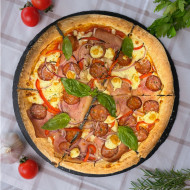 Pizza consistenta cu blat crocant, sos de rosii, mozzarella, mix de mezeluri (prosciutto, salam, bacon, copa), rosii cherry, capere si un strop de otet balsamic. Gust intens, savuros si echilibrat.