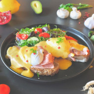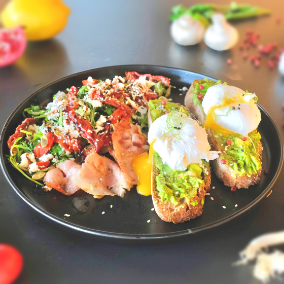 O felie crocanta de paine prajita, unsa cu avocado cremos si servita cu ou posat, bacon crocant, feta, rosii uscate si ardei copt. Combinatia este completata de un mix fresh de salata verde, rucola, capere si microplante, asezonate cu suc de lamaie si otet balsamic. Un preparat echilibrat si hranitor, perfect pentru un mic dejun sanatos sau un brunch delicios.