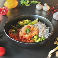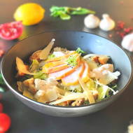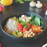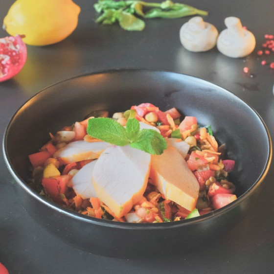 O alegere sanatoasa si echilibrata, bogata in proteine si fibre: piept de pui fraged, naut si linte fierte, legume proaspete (rosii, castraveti, morcov, ardei, ridichi) si rodie pentru un strop de dulceata naturala. Asezonata cu ierburi aromatice (marar, patrunjel, menta, busuioc) si un dressing simplu din ulei de masline si lamaie. Un preparat complet, usor si plin de gust – ideal pentru un pranz energizant.