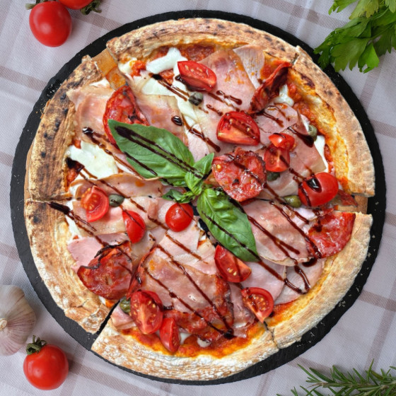 Pizza consistenta cu blat crocant, sos de rosii, mozzarella, mix de mezeluri (prosciutto, salam, bacon, copa), rosii cherry, capere si un strop de otet balsamic. Gust intens, savuros si echilibrat.