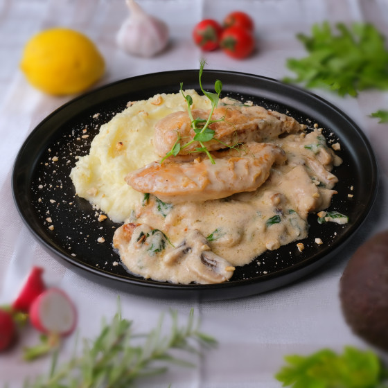 piept de pui, ciuperci,baby spanac, gorgonzola, smantana,cartofi piure, sare si piper