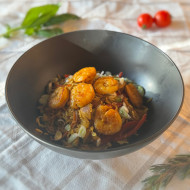 (creveti cruzi decorticati, dovlecel în crusta panko, faina, ou, pesmet panko, rosii, ceapa, usturoi, ulei de masline, brânza feta, oregano, sare, piper)