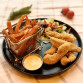 (piept de pui crispy, faina, ou, pesmet panko, cartof dulce prajit cu parmezan, salata verde, rucola, rosii cherry, ardei, castravete, masline Kalamata, ulei de masline, sos aioli, sare, piper, cimbru)