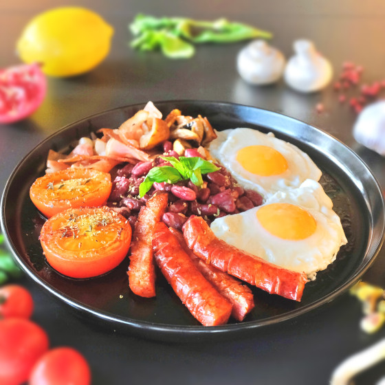 Un mic dejun clasic si satios, perfect pentru un inceput de zi energic. O combinatie generoasa de oua gatite, bacon crocant, carnati aromati, fasole in sos de rosii, ciuperci sotate si rosii proaspete. Servit alaturi de painica calda cu unt si sos brun savuros. Gust autentic, inspiratie britanica!