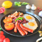 Ingrediente: Oua, bacon, carnati, fasole in sos de rosii, rosii, ciuperci, painica, unt, sare, piper, sos brun.