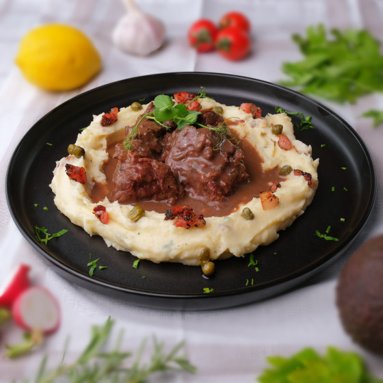 obrajori de vita, piure de cartofi, guanciale, capere, unt, patrunjel,sare si piper