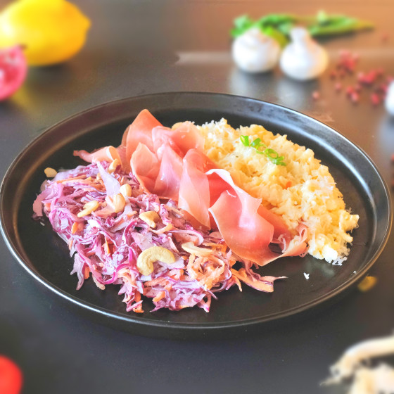 Ingrediente: oua, unt, jamon serrano, brânza grana, pâine, varza rosie, morcov, mar, caju, mix de seminte, ulei de masline, otet de mere, maioneza, miere, sare, piper