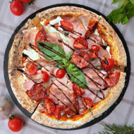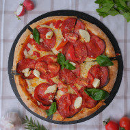 Pizza cu blat crocant, sos de rosii, mozzarella si crenvursti de casa de la Popesti, completata cu porumb dulce. Gust clasic, echilibrat si potrivit pentru toate varstele.