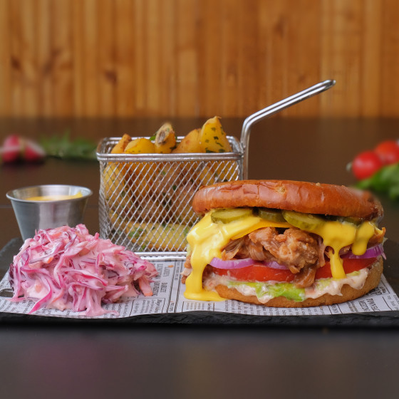 Chifla kaiser cu seminte, umpluta cu carne de porc gatita lent, branza chedar topita, castraveti murati, ceapa rosie, sos BBQ, maioneza si salata coleslaw. Gust intens, dulce-picant si textura perfecta intre crocant si fraged.