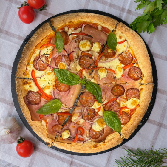 (blat pizza, mozzarella, cârnat de la Popesti, bacon, ardei, ceapa rosie, ulei de masline aromatizat, oregano)