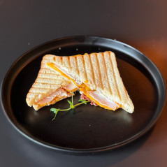 Sandwich din paine integrala cu piept de pui afumat, crema de branza, cheddar topit si rosii uscate. Servit cu chips crocanti. Gust intens si echilibrat, perfect pentru pranz.